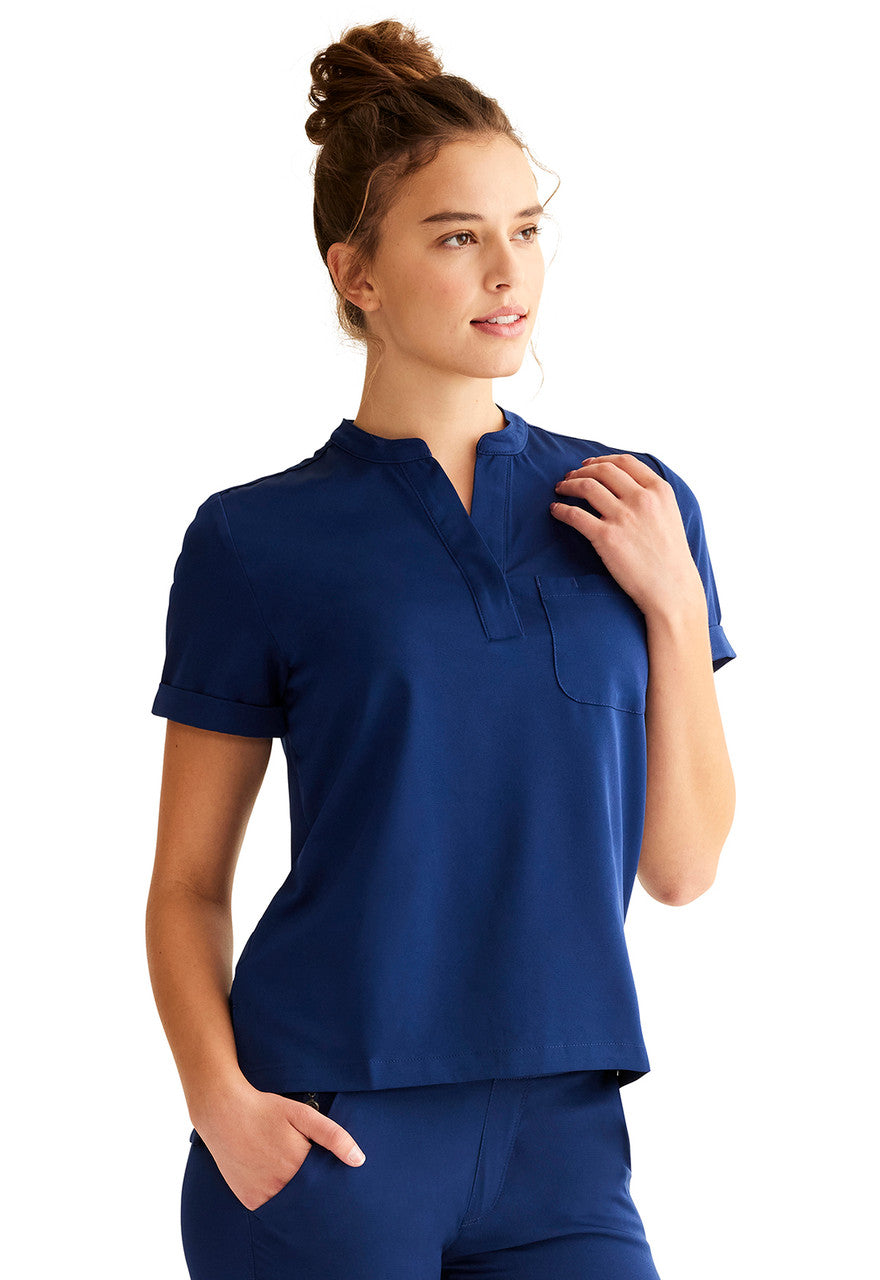 This top not only looks great but also ensures that you are fully equipped to handle the multifaceted requirements of your job. The durable fabric and thoughtful construction enable you to move with ease, while the elegant design keeps you looking professional in any healthcare environment.