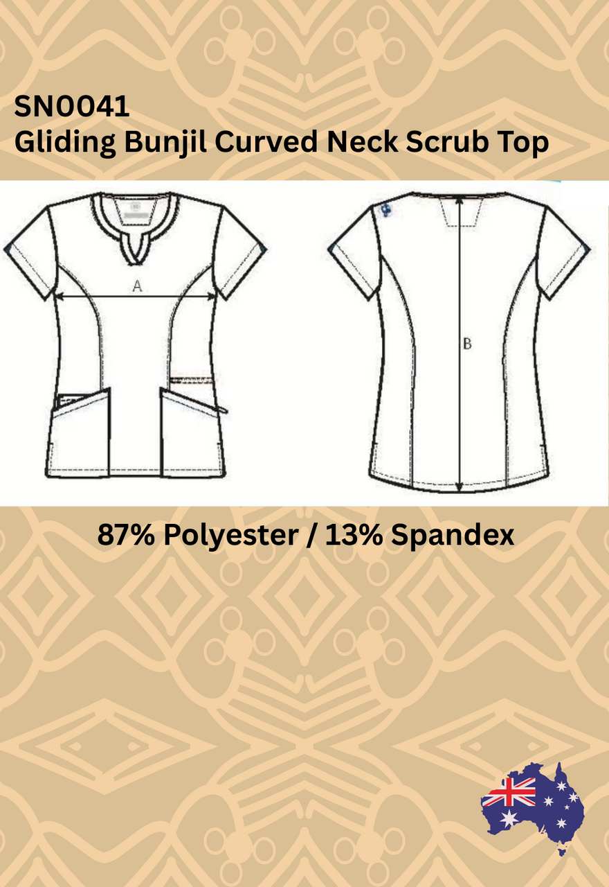 Celebrate culture, movement, and modern professionalism with the Gliding Bunjil Curved Neck Scrub Top—where comfort meets meaning in a standout piece of nursing scrubs.