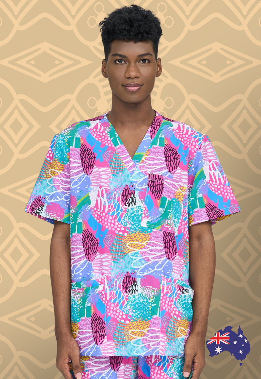 Practical, durable, and meaningful, the Gliding Bunjil Unisex V-Neck Top is a versatile choice in medical scrubs that balances culture, comfort, and performance for today’s healthcare professionals.