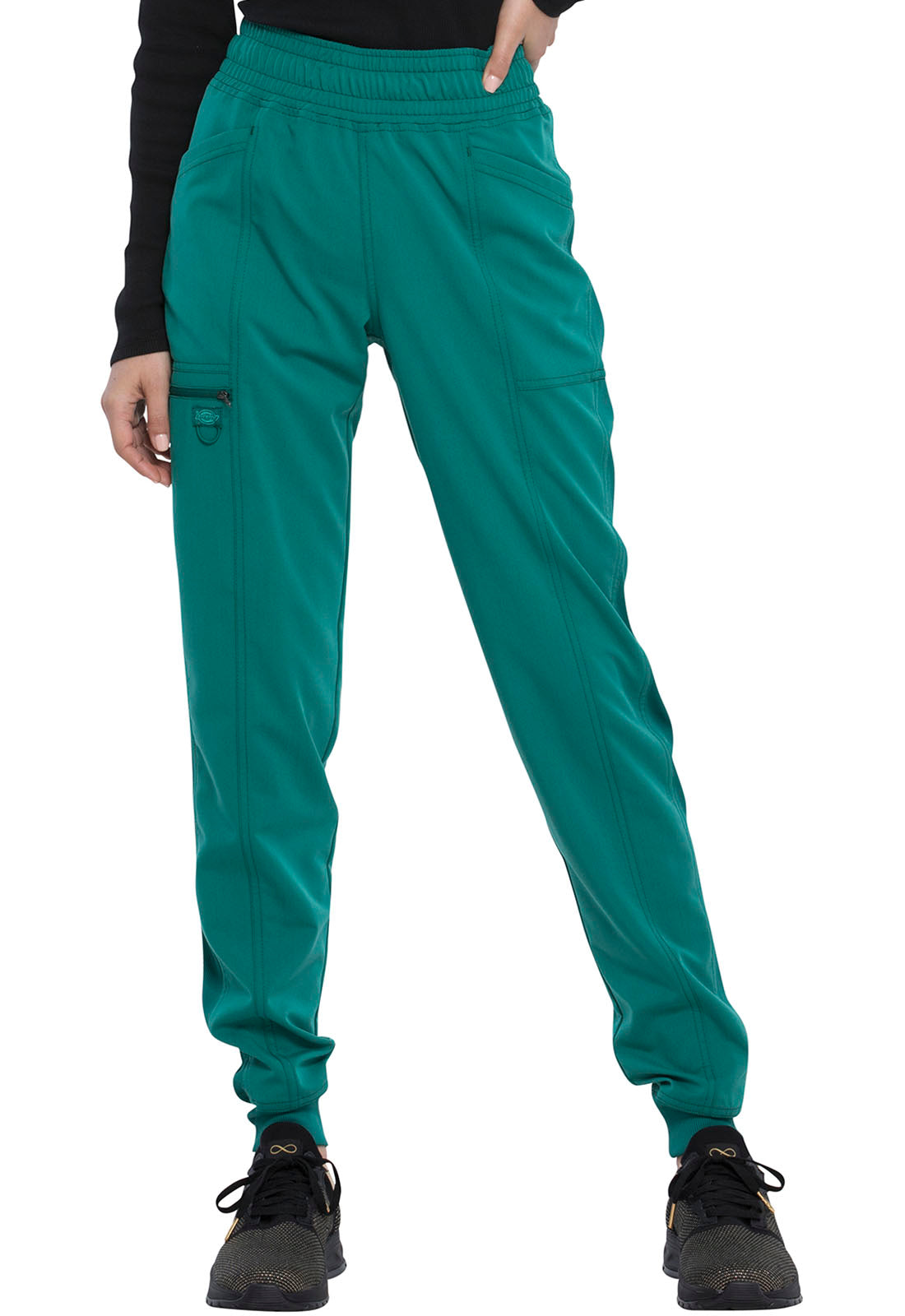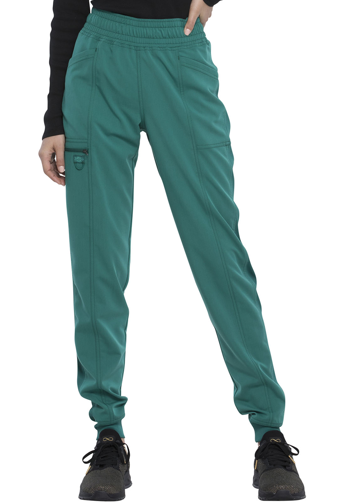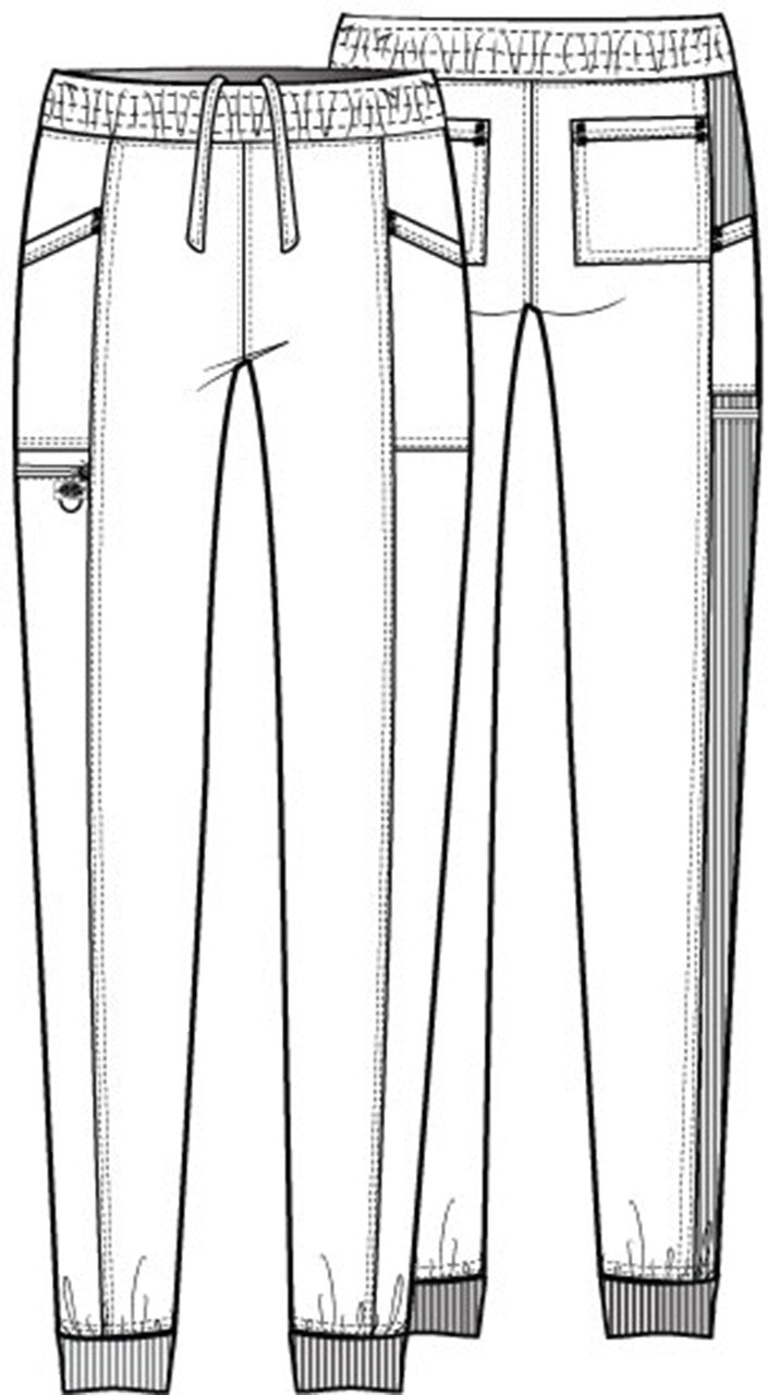 This Contemporary fit, mid rise jogger features an enclosed elastic waistband and interior drawstring. There are front leg seams for a lengthening effect plus back side panels in comfort rib-knit. Five pockets offer plenty of storage: two roomy front pockets, a security zip pocket with an elastic bungee on the wearer's right and two back pockets. Back pockets feature reverse hem trim for extra design points. Rib-knit cuffs complete the look. Tapered leg, 8 1/2" opening. Inseam: 26 1/2". 77% Polyester / 20% Rayon / 3% Spandex Twill.